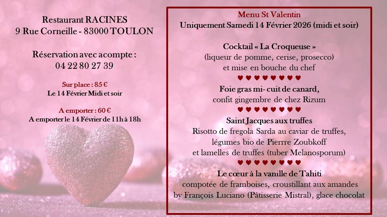 Le 14 février, midi et soir, le Restaurant Racines vous invite à vivre une parenthèse gourmande et romantique autour d’un menu spécial Saint-Valentin, imaginé pour sublimer ce moment à deux. Dans une ambiance chaleureuse et raffinée, laissez-vous séduire par une cuisine sincère, généreuse et pleine d’émotions.